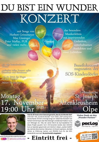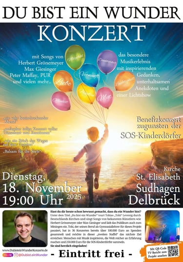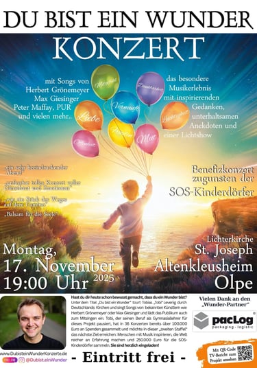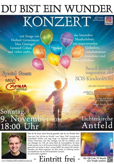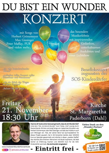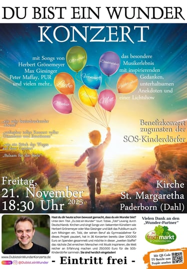 Sei live bei einem der Konzerte dabei. Eintritt frei - keine Anmeldung nötig. Lass uns das Wunder feiern, das wir sind, und dabei Kindern in Not helfen...