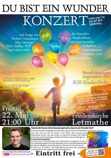 Sei live bei einem der Konzerte dabei. Eintritt frei - keine Anmeldung nötig. Lass uns das Wunder feiern, das wir sind, und dabei Kindern in Not helfen...
